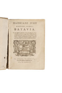 [JUNIUS]. — Hadriani Ivnii Hornani, Medici, Batavia […]. — S. l., Ex Officina Plantiniana, Apud Franciscum Raphelengium, 1588. — In-8° carré (153 x 212 mm), vélin ivoire souple de l'époque, titre à l'encre au dos.