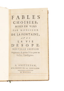 LA FONTAINE (Jean de). — Fables choisies, mises en vers […] avec la Vie d'Esope. — À Amsterdam, Aux Dépens de la Compagnie, 1730. — Petit in-12, veau, dos lisse orné à la grotesque, tranches dorées (reliure de l'époque).