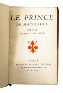MACHIAVEL. — Le Prince. — Préface de Benito MUSSOLINI. — Paris, Helleu et Sergent, 1929. — In-12, maroquin brun, dos à nerfs orné, couverture conservée (reliure de l'époque).