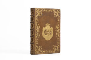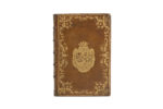havane, dentelle dorée encadrant les plats avec aux centres de grandes armoiries aux petits fers, dos à nerfs orné, tranches dorées, gardes de moire bleue (reliure de l'époque).