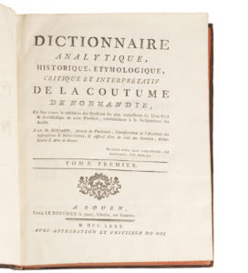 [NORMANDIE]. — HOÜARD (David). — Dictionnaire analytique, historique, étymologique, critique et interprétatif de la Coutume de Normandie […]. — A Rouen, Chez le Boucher le jeune, Libraire, 1780-1782. — 4 volumes in-4°, veau marbré, dos...