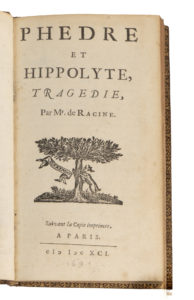 RACINE (Jean). — Phedre et Hippolyte, tragedie. — A Paris, 1691. — Petit in-12 (73 x 130 mm), maroquin brun, double encadrement de filets à froid ornant les plats, fleuron doré aux angles, dos à nerfs, tranches dorées (reliure fin XIXe s.).