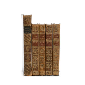 Dos légèrement passé, coiffes abîmées, piqûre de ver au mors du dernier tome.