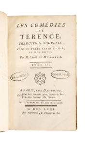 TÉRENCE. — Les Comédies. — Traduction nouvelle, avec le texte latin à côté et des notes par M. l'abbé LE MONNIER. — A Paris, Chez Ch. Ant. Jombert père, Cl. Aut. Jombert fils, libraires, de l'imprimerie de Louis Cellot, 1771. — 3...