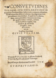 [TOULOUSE]. CASEVIEILLE (Jean de). — Consuetudines Tolosae, cum declarationibus in quibus Consuetudines […] Joan Casaveteri in ligibus licentiari civis Tolosae. — Tolosae, in officina Anthonii Vincentii, apud Ludovicum Yuernaige, Impressum per...