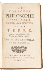 [VILLENEUVE (Daniel JOST DE)]. — LISTONAI (Mr. de). — Le Voyageur philosophe dans un pais inconnu aux habitans de la terre. — A Amsterdam, Aux dépens de l'Éditeur, 1761. — 2 tomes en un volume in-12, veau brun, triple filet doré encadrant...