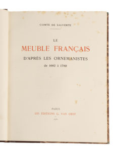 [ÉBÉNISTES]. — SALVERTE (François de). — Le Meuble français d'après les ornemanistes de 1660 à 1789. — Paris, Les Éditions G. Van Oest, 1930. — In-4°, demi-chagrin brun, dos à nerfs, couverture conservée (reliure de l'époque).