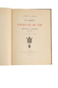 KOECHLIN (Jean Léonard). — Les Ordres de la Couronne de Fer et de la Couronne d'Italie (1805-1905). — Paris, Plon-Nourrit et Cie, Imprimeurs-Éditeurs, 1907. — In-4°, demi-maroquin vert, dos à nerfs orné, couverture conservée (Ateliers...