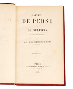 LA ROCHEFOUCAULD-LIANCOURT. — Satires de Perse et de Sulpicia, traduites en vers français. — Paris, Morris et Cie, 1857. — In-8°, maroquin à long grain rouge, dentelle dorée encadrant les plats, dos lisse orné, tranches dorées (reliure de...