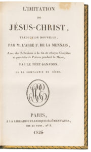 LAMENNAIS (Félicité de). — L'Imitation de Jésus-Christ. — Traduction nouvelle. — Avec des réflexions à la fin de chaque chapitre et précédée de prières pendant la messe, par le père SANADON. — Paris, A la Librairie...