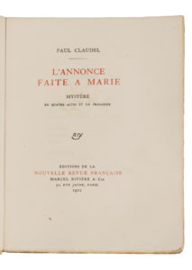 CLAUDEL (Paul). — L'Annonce faite a Marie. — Mystère en quatre actes et un prologue. — Paris, Éditions de la Nouvelle Revue Française, Marcel Rivière & Cie, 1912. — In-8° broché.