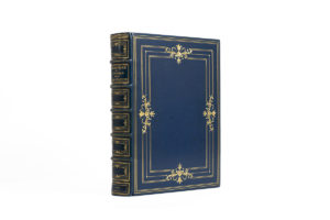 contre-plat de maroquin bleu, finement encadré de dentelles, filet et décors en rocailles et guirlandes dorées, tranches dorées sur témoins, garde de moire bleue, couverture conservé, chemise demi-maroquin bleu à bande, étui (Canape R. D. - 1912).