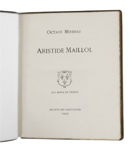 MIRBEAU (Octave). — Aristide Maillol. — Paris, Aux armes de France, Société des Dilettantes, 1921. — In-4°, basane verte, filet à froid encadrant les plats, petit cartouche de maroquin ocre avec l'auteur et le tire sur le coin sup., dos...