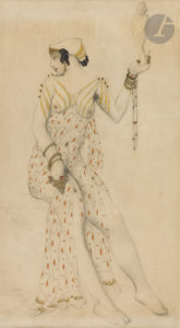 Cette belle maquette de costume, très achevée, pourrait donc se rattacher au ballet Schéhérazade, probablement pour une des trois Odalisques.