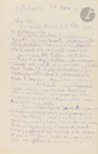 – On joint une autre L.A.S., [fin mars ou début avril 1892] (4 p. in-12). Il viendra voir son ami à l’hôtel Terminus : « Nous établirons ensemble le programme de ton voyage on te donnera les explications les plus étendues et les plus claires tant sur le voyage que sur le choix de ton séjour là bas et les moyens de t’y installer toutes explications qui ne peuvent se donner que de vive voix. Je regrette de ne pas avoir été fixé sur ton désir bien arrêté d’aller nous remplacer dans notre lit tout chaud à la Villa Bleue, mais nous n’avons pas osé nous avancer avec le maître du lieu dans l’incertitude où nous étions. […] Un autre regret c’est de ne point te donner une idée du pays sur le vu de mes études. – Mais tu en auras la surprise là-bas »...