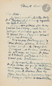 « Je vois avec plaisir que tu as fait un bon voyage, sans trop de fatigue et surtout que tu as le moral bon, l’appétit robuste et j’en suis heureux. Il n’est pas douteux que la bonne chaleur aidant, la vue de ce beau pays, la tranquillité de l’esprit... et du cœur surtout tu ne retrouves un regain de force et de vitalité qui te feront le plus grand bien phisiquement ». Il lui conseille de rester quelques jours à Saint-Raphaël, et de se laisser « aller à cette douce béatitude que donne là haut, le bon air le soleil... Oh le soleil nous l’avons encore ici sur le jour de ton départ, un ciel si pur que c’est un morceau de lapis. […] Je reprends mes pinceaux. […] Hier j’ai expédié mes tableaux au Salon »...