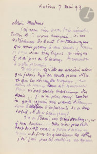 Eugène BOUDIN. — L.A.S., Antibes 7 mai 1893, à Mme MARTIN ; 4 pages in-8 à l’encre violette.Sur son travail à Antibes.