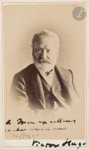 Victor HUGO (1802-1885). — Photographie avec dédicace autographe signée ; épreuve albuminée format carte de visite montée sur carte (10,5 x 6,2 cm).