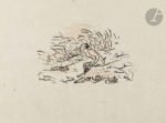 – frontispice volant sur Japon vergé pelure (scène faunesque champêtre) aquarellé en rose.