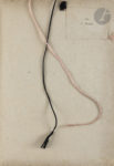 Le fin fil de soie rose, qui manque aux ex. reliés, était noué en 2 petits trous de part et d’autre de la pliure de la couv. et retenait les 4 doubles ff. Il s’est détaché par un côté et a bruni naturellement la pliure du bas du cahier central en fragilisant les autres ff. au même endroit (trois ont été doublés d’une bande de Japon pelure).