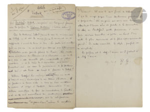 Manuscrit de son compte rendu élogieux de la réédition Perrin du Vathek, paru dans le Mercure de France, octobre 1893 (p. 170-71). Le manuscrit, raturé, a servi à l’impression (cachet du Mercure et notes typographique) ; sur des feuillets simili-Japon, il est signé des initiales.