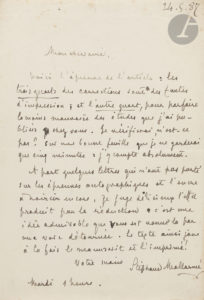 Stéphane MALLARMÉ. — 2 L.A.S. « Stéphane Mallarmé », [mai-août 1887], à Édouard DUJARDIN ; 1 page grand in-8 (20,2 x 13,5 cm) sur papier vergé ; 1 page et demie in-fol (31 x 20 cm) sur papier vélin (légères fentes aux plis...