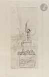 2a). – 2e état avec les 3 croquis dans la marge inf. [Rouir 822/2, date erronée de 1887. – Exsteens 526, peu au fait des éditions. Le Suppl. du cat. Ramiro de 1895 s’arrête au n° 678 de cet état en cours.] C’est celui-ci que Mallarmé aura reçu de Rops qu’il remercie le 10 mars 1895 en s’exclamant au « chef-d’œuvre entre les vôtres, évaporé de sa grandeur première dans mon esprit [La Grande Lyre] et le hantant, ici, en la réduction » (voir l’autographe au n°102). 2b). – 6e état avec ces derniers effacés et les 6 remarques marginales ajoutées [Rouir 822/6] avant qu’elles ne disparaissent lors de la réduction du cuivre pour l’édition Deman [Rouir 796, date erronée 1889]. Cet état est déjà publié en 1896 dans le 3e fasc. Rops de La Plume (n° 174 du 15 juillet 1896 p. 424).
