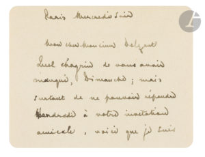 Quel chagrin de vous avoir manqué, Dimanche [au Concert Lamoureux] ; mais surtout de ne pouvoir répondre Vendredi à votre invitation amicale, voici que je suis pris maintenant, ce jour là et quelques autres, un peu au delà de l’heure du déjeûner, par une leçon [d’anglais à Ernest Chausson]. Mais tout ceci n’est que partie remise, du moins le plaisir de vous serrer la main, parmi les papiers précieux »…