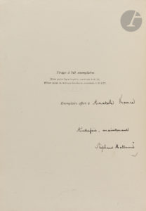 Un des [74] ex. HC (voir détails 65) sur vergé léger de Hollande portant imprimé au-dessous de la justif. : « Exemplaire offert à », complété par l’envoi autographe signé à l’encre :