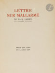 – Paul VALÉRY – Lettre sur Mallarmé. [Paris] Pour les Amis de Lucien Kra, [1927], in-8 carré br. Lettre à Jean Royère pour la préface de son livre sur Mallarmé paru chez Kra le 2/6/1927. Tiré à part (sans modification de pagination) à 15 ex. num. hc. Un des 11 sur vélin d’arches, n° 13 (Karaïskakis-Chapon, 92A). [Elle sera vendue par Gallimard l’année suivante.] À l’état de neuf.