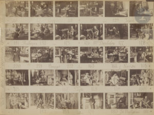 ♦ Rare planche publicitaire de Nos contemporains chez eux sur papier albuminé avec les trois seules prises de vues de Mallarmé rue de Rome en [avril 1893] : assis devant le cabinet japonais exposant Baudelaire et Banville, assis dans son rocking-chair près du poêle, et debout. Portent les numéros 179-181 de la feuille 11 aux 30 portraits numérotés (Coppée, Richepin, Bourget, Loti etc.).