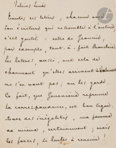 « Toutes ces lettres, chacune avec son écriture qui ressemble à l’auteur, c’est gentil : celle de Jeannie, par exemple, tout-à-fait Mauclair. Les lettres, aussi, ont cela de charmant qu’elles arrivent à Valvins et ne s’en vont pas ; on les garde. Ce fait, que Geneviève reprenne sa correspondance, est bon signe. Avec des inégalités, ma femme va mieux, certainement ; mais les forces, si lentes à revenir ! Autrement, le séjour de Valvins suffit, on n’y a pas froid, du tout : et, comme le dit notre ami Drumont, c’est autre chose que l’été, maintenant ; voilà tout. Il place par discrétion, sur l’autre rive, les jeunes filles ; leurs voix et leurs toilettes, parties. (Merci à Madame Pontillon [sœur de Berthe Morisot]). Merci à Julie et à Paule d’avoir dit :