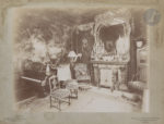 Dans le salon, Méry lisant (yeux baissés retouchés), assise sur le divan à fourrure près de la cheminée (22 x 27,6). Sur le miroir, Méry ou La Naissance de Vénus par Gervex récemment acquise en 1896. Sur le mur, plusieurs peintures pourraient être identifiées. (Reprod. en petit in Sotheby’s infra). C’est le pendant de l’autre cliché célèbre de Méry jouant au piano pour Mallarmé et Gervex qui montre le côté opposé de la même pièce avec l’Exécution de Maximilien par Manet. Ce cliché est donné pour la 1ère fois à La Photographie Nouvelle [auparavant à Dornac] dans le cat. d’exposition d’Anne Borrel Femmes de Mallarmé (Vulaines-s.-Seine, Musée Mallarmé, Liénart (2011) p. 85), puis dans Portraits de M., 2013 p.75 (la meilleure reprod. avec son carton impr.), mais sans préciser que Henri Mairet en est le photographe.