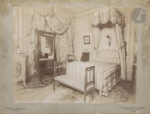 2) Dans sa chambre à coucher, Méry est assise en train de lire appuyée au guéridon (22,1 x 28,5). À droite du baldaquin du lit brodé à ses initiales, tout en haut, son portrait à l’huile par Gervex, et du même, l’esquisse Rosette à l’aquarelle pendue sur le miroir comme la Naissance de Vénus dans le salon cf. supra (les 3 Gervex à la Bibl. litt. J. Doucet).