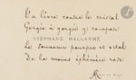 La lettre est accompagnée de ce quatrain sur la carte de visite de Mallarmé [il a été recopié dans l’album de Méry Laurent avec l’indication du don d’un verre d’eau, et publié dans les Vers de circonstance en 1920 (p. 84, iv)].