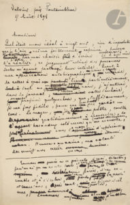 Ce brouillon présente de nombreuses ratures, corrections et additions interlinéaires, et de nombreuses variantes (partiellement relevées dans la Pléiade) avec le texte publié, qui est daté du 18 août ; il existe un deuxième état, non définitif, à la Bibliothèque littéraire Jacques Doucet (MNR Ms. 1241). Nous relevons entre crochets quelques-uns des mots biffés.