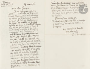 Camille PISSARRO (1830-1903). — L.A.S. avec dessin, Rouen 27 mars 1896, à son fils Georges PISSARRO ; 2 pages et demie in-8, enveloppe timbrée.