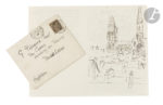 Au verso, sur une pleine page (17,7 x 11,5 cm), dessin à la plume et encre brune représentant les toits du vieux Rouen et la cathédrale.