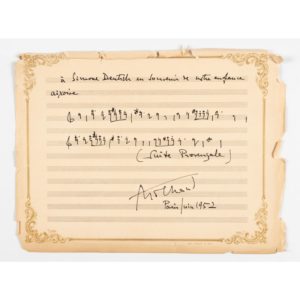 2 lignes musicales, de la "Suite provençale", œuvre symphonique écrite en 1936, avec un envoi "à Simone Deutsch en souvenir de notre enfance aixoise".