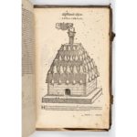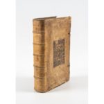 Valgrisi, 1570. — 2 parties en un vol. in-folio, (34) ff. n. ch. dont le titre, 956 pp. (Commentarii), (6) ff. n. ch. (De ratione distillandi aquas ex omnibus plantis) ; peau de truie estampée à froid sur ais de bois bisautés, armoiries estampées au centre du plat supérieur - dans un encadrement orné et avec les figures de la Justice et de la Fidélité - le tout peint et noir et rouge, dos à nerfs, fermoirs, titre ciselé sur les tranches dorées (Rel. ép.).