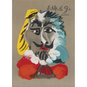 D'après Pablo PICASSO (1881-1973) — Mousquetaire en col rouge — De la série des Portraits Imaginaires par Marcel Salinas — Lithographie en couleurs sur papier brun — Numérotée "F132/250", timbrée