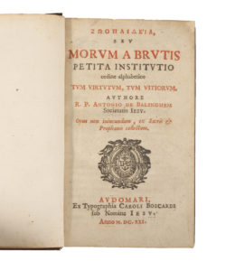 BALINGHEM (Antoine de). Morum a brutis petita institutio, ordine alphabetico tum virtutum, tum vitiorum (...). Audomari, Caroli Boscardi, 1621. Petit in-12, basane brune, dos à nerfs orné, tranches rouges (reliure pastiche "Closs"). Reliure...