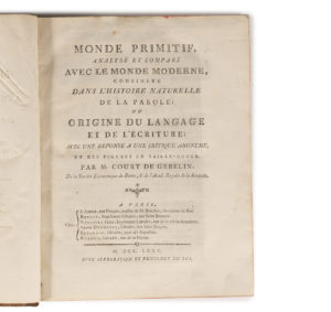 COURT de GEBELIN (Antoine). Monde primitif, analysé et comparé avec le monde moderne [...]. A Paris, Chez l'auteur, Boudet, Valleyre l'aîné, Veuve Duchesne, Saugrain, Ruault, 1773-1778. 6 volumes in-4, demi-basane marbrée, dos à nerfs orné,...