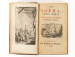 CREBILLON fils (Claude-Prosper Jolyot)]. Le Sopha, conte moral. Nouvelle édition. A Pékin, chez l'Imprimeur de l'Empereur, 1749. 2 parties en un vol. in-12, bradel cartonnage marbré (reliure fin XIXe siècle). Dos passé, petites mouillures....