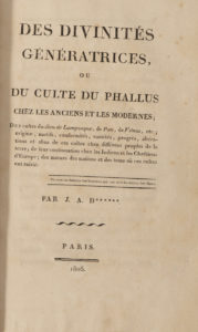 CURIOSA]. [DULAURE (Jacques-Antoine)]. Des Divinités génératrices, ou du culte du phalus chez les anciens et les modernes [...]. Par J.A. D***. Paris, 1805. In-8°, demi-maroquin rouge, fine guirlandes dorées encadrant les plats, dos lisse orné,...