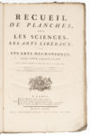 de la seconde livraison comprenant : Arts libéraux et mécaniques, faiseur de métiers à bas, batteur d'or, blanc de baleine, blanchissage des toiles (21 planches) ; Art héraldique (27 planches et 6 planches de supplément) ; Alphabet et écriture (25 planches), Ecritures (16 planches), Charpente (51 planches) ; différents métiers, etc. JONT un recueil de 324 planches Histoire naturelle (54 planches n°de 51 à 104) ; pêche (35 planches) ; Minéralogie, montagnes et volcan (47 planches), Minéralogie, mine, métallurgie, salpètre et poudre, ardoise (110 planches), fromage (4 planches) ; divers (dont miroitier, porcelaine, sculpture, fonte, etc, 74 planches). Ensemble 535 planches.