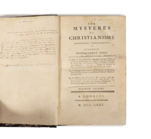 ESOTERISME]. [BEBESCOURT]. Les Mystères du Christianisme approfondis radicalement et reconnus physiquement vrais. A Londres, 1775. 2 parties en un volumes in-8°, demi-basane bleu nuit, dos lisse orné (reliure XIXe siècle). Ex-libris et étiquette...