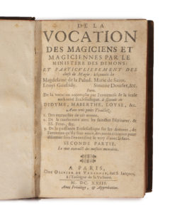 disant princesse de la Magie [...]. Où il est aussi traicté de la Police du Sabbat & secrets de la Synagogue des magiciens & magiciennes, de l'Antechrist & de la fin du monde [...]. De la Vocation des Magiciens et magiciennes par le ministère des démons [...]. A Paris, Chez Olivier de Varrennes, 1623. 2 volumes in-12, veau marbrée, dos à nerfs orné, tranches rouges (reliure de l'époque). Annotations manuscrites de bibliographie sur les gardes. Complet des deux tomes, présentés comme extraits des Mémoires de Nicolas de Montmorency, où il est notamment traité des exorcismes de Madeleine La Palud, Marie de Sains, Simone Dourlet, pratiqués par Sébastien Michaëlis, grand inquisiteur de la foi en Avignon et consulté en matière de démonologie.