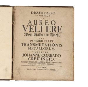 ESOTERISME]. CREILING (Johanne-Konrad). Dissertatio academica de aureo vellere, aut possibilitate transmutationis metallorum. Tubingae, Antonii Henrici Roebelii, s.d. (1737). Trois parties en 1 volume in-4°, basane brune, dos à nerfs avec titre...