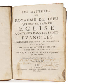 MARS (R.P. Simon). Les Mystères du Royaume de Dieu qui est sa sainte Eglise contenus dans les Saint Evangiles, distribuez par tous les dimanches de l'année, expliquez en autant de sermons composez et prechez. A Douay, Michelle Mairesse, l'an 1691....